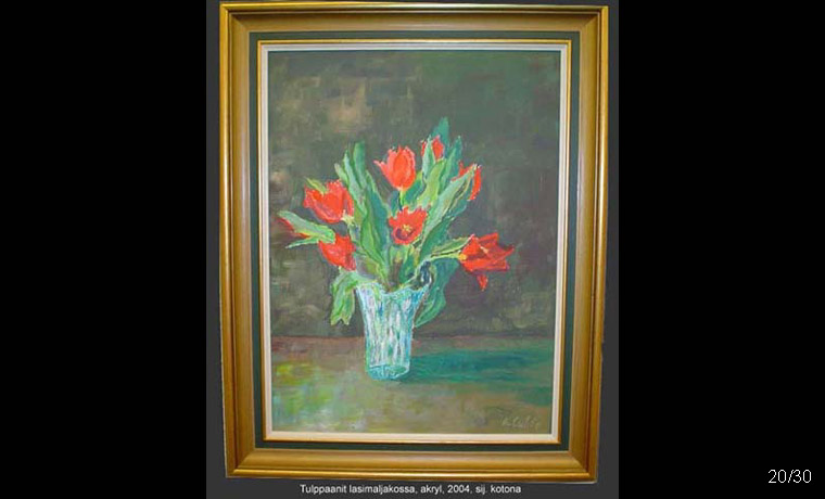 Tulppaanit lasimaljakossa, akryl, 2004 sij. kotona
